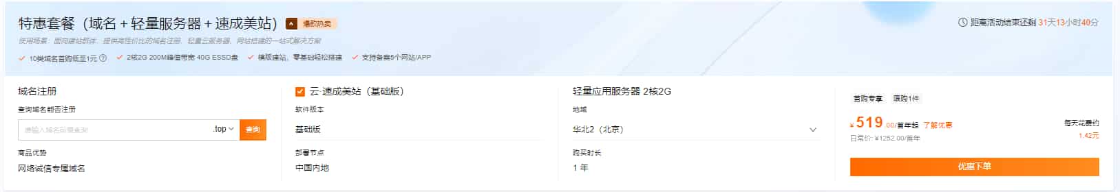 1、新用户专享百元套餐|轻松搞定域名+轻量应用服务器+模板建站