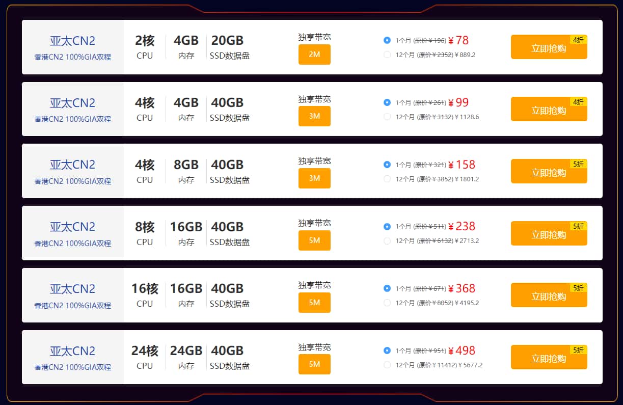 尊云香港云服务器提供六款方案可选,全部接入香港国际动态BGP多线,回国电信CN2 GIA双程+移动/联通BGP直连,延时低至20ms,是用户国际业务的高速通道,免备案。
